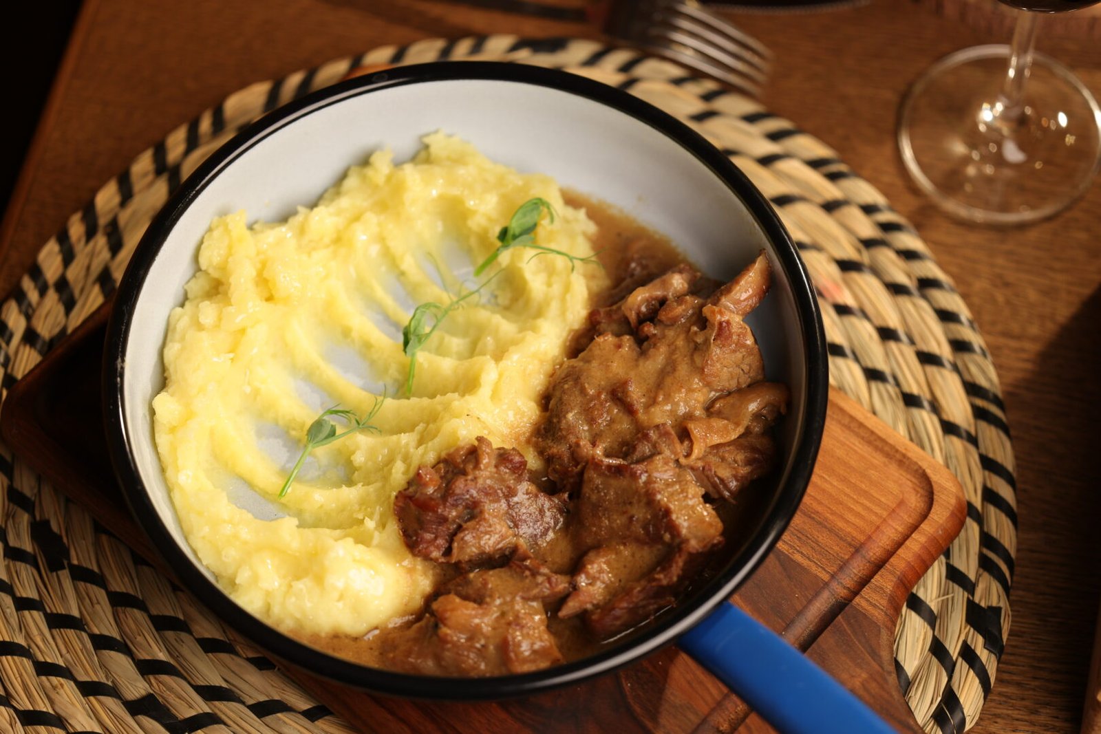 Glavna jela Gulaš od gljiva zapečen u bundevi 1050 rsd Sezonsko Domaća kobasica punjena čedar sirom na vasabi pireu sa džemom od crvenog luka i borovnice 1260 rsd Teleći kotlet 2690 rsd bebi šargarepa i krompir, sos od vina i suvih šljiva Biftek fuego (sous vide povrće) 2760 rsd Juneći ribić u saftu 1530 rsd Prilog pire krompir od celera Pogledaj ceo meni