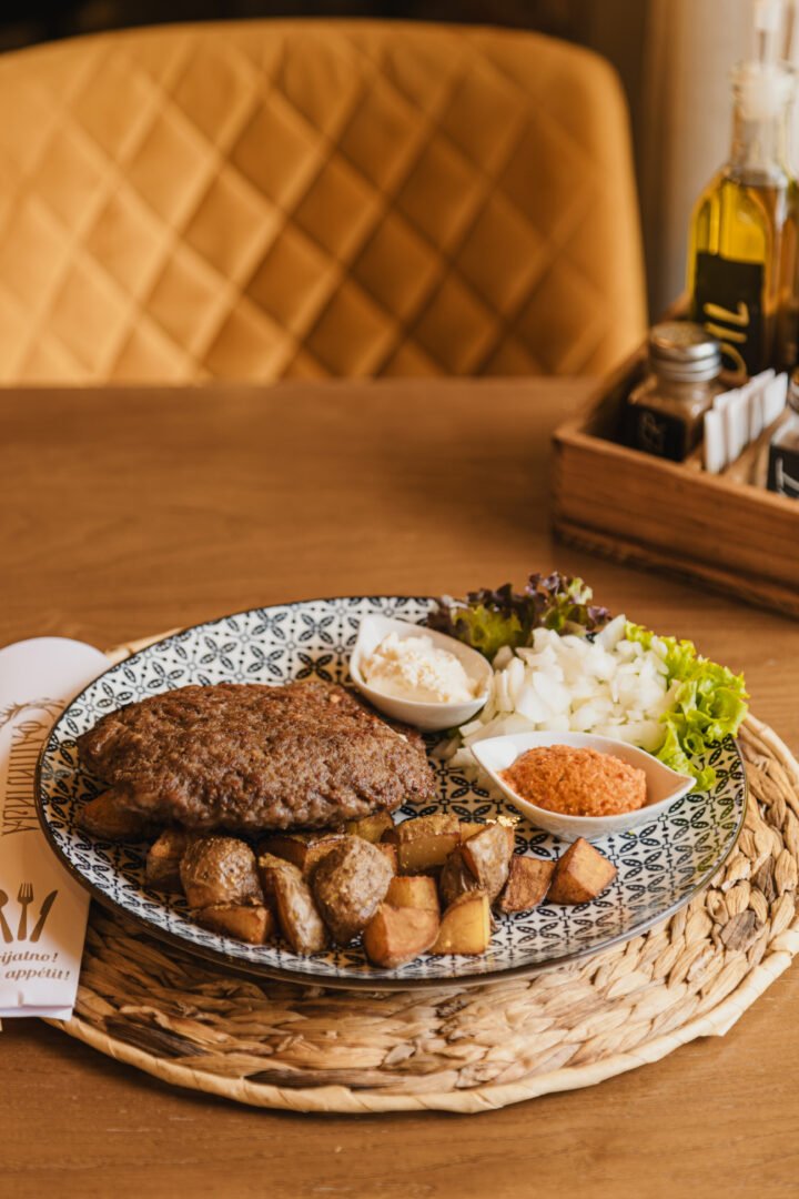 Roštilj Salašarska plata 1kg 3450 rsd Mini karađorđeva, pileći file u sosu od šampinjona, batak, ćevap, uštipak, rolovan pileći ražnjić, krompir, luk, tartar sos Plata mešanog mesa 1kg 2980 rsd Ćevapi rolovani, batak ražnjić, uštipak, kobasica, pileći file, mini pljeskavica, krompir, ajvar, kajmak, luk Rolovan pileći ražnjić u slaninici 1190 rsd Prilog krompirići Roštilj kobasica sa umakom od senfa 1050 rsd Uštipci 1280 rsd Slanina, trapist, ljuta tucana paprika Pogledaj ceo meni